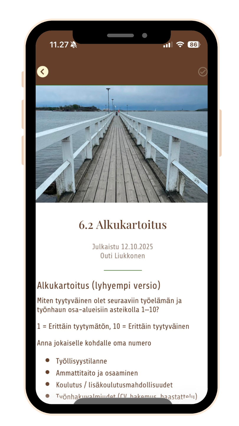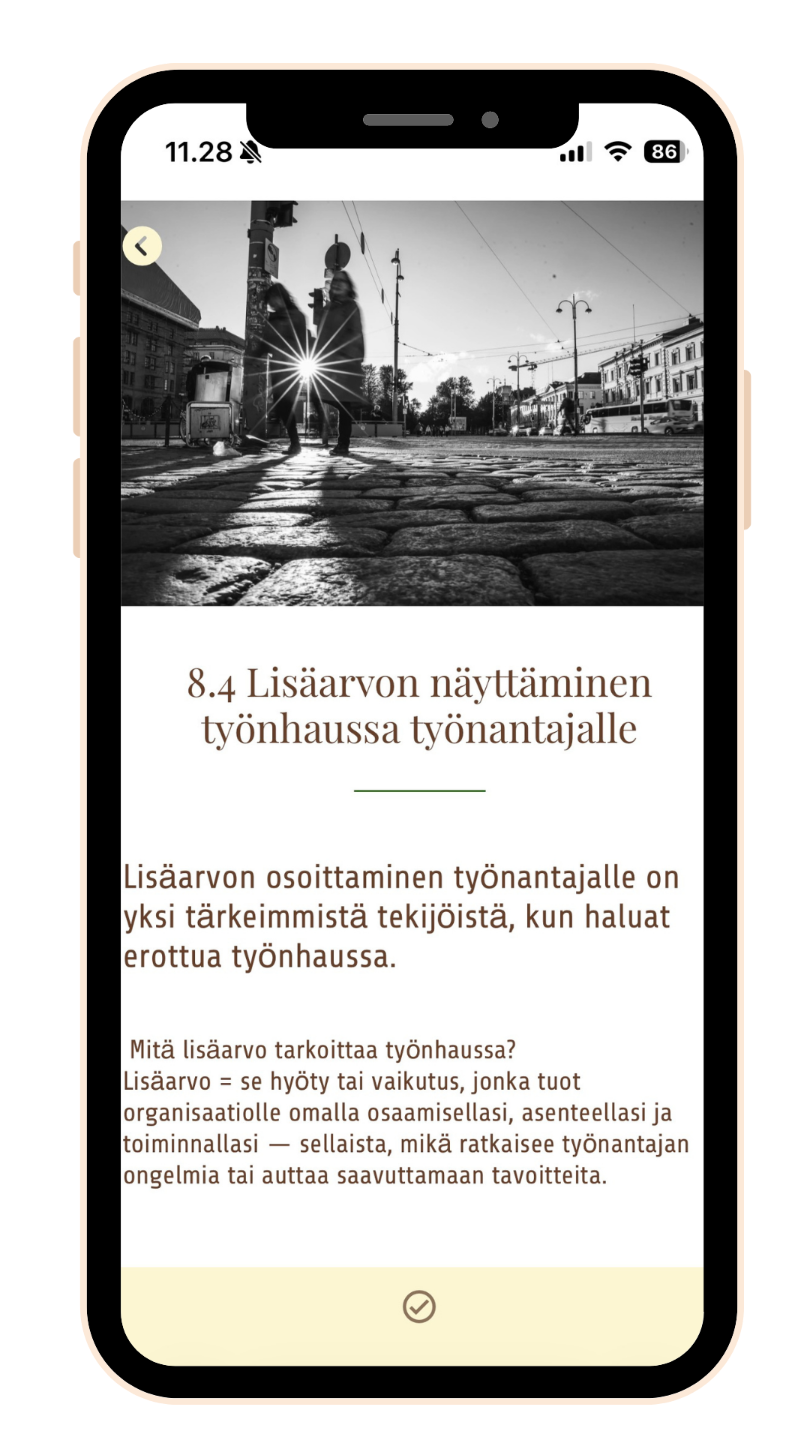 Apin sisältö on paljon enemmän kuin työnhaun väline. Se on itsetutkiskelun apuväline, minkä koen olevan kaikkein tärkeintä, kun mietin seuraavia askeleita omalla urallani. Sovellus tuntui voimaannuttavalta, innostavalta ja kannustavalta.